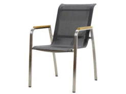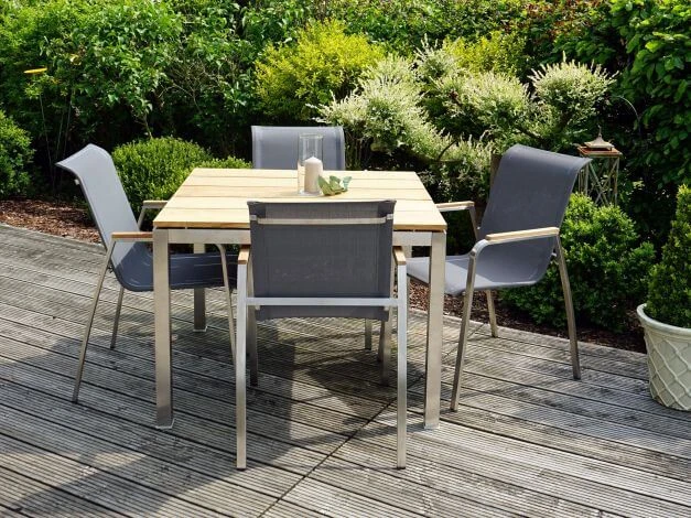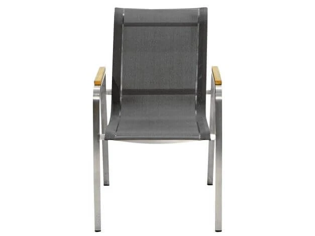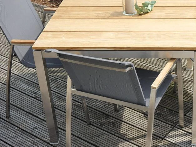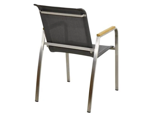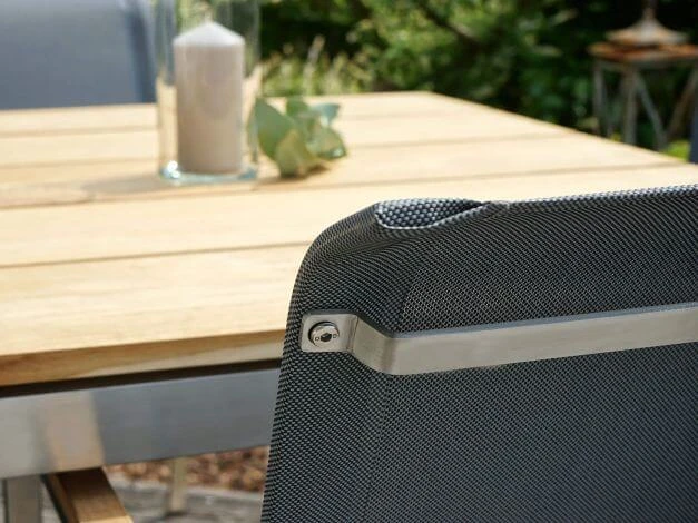 Formschön sind die Armlehnen aus hochwertigem Teakholz sowie der Rahmen aus gebürstetem Edelstahl. Der Einsatz hochwertiger Materialien garantiert zudem nicht nur eine lange Lebensdauer, sondern auch eine beeindruckende Beständigkeit gegenüber den Elementen. Die SItzfläche ist mit einer wetterfesten Textilbespannung versehen, die schnell trocknet und auch ohne Polster einen angenehmen Sitzkomfort bietet.