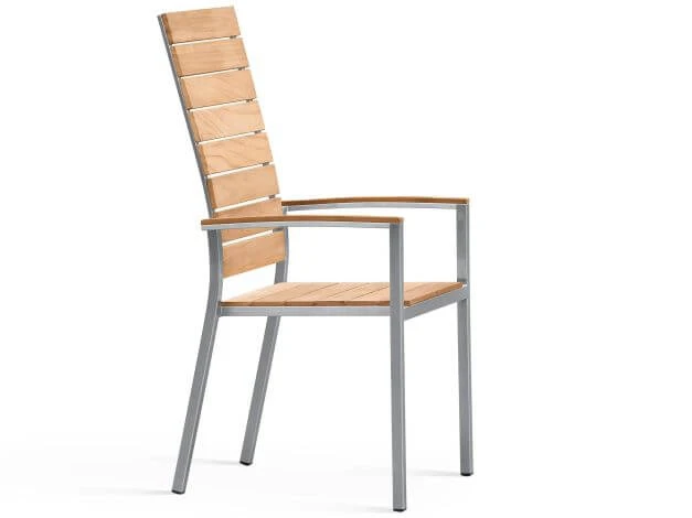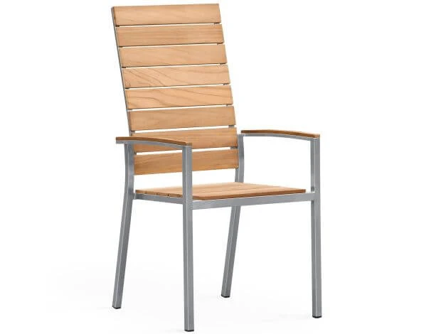Der stapelbare Gartenstuhl Valis Highback kombiniert zwei der beliebtesten Materialien für Gartenmöbel. Der Rahmen mit moderner, gerader Linienführung besteht aus hochwertigem Edelstahl, welches enorm resistent gegen Rost ist und eine hohe Stabilität bietet, die Belattung mit edlen Teakleisten setzt dazu warme, natürliche Akzente.