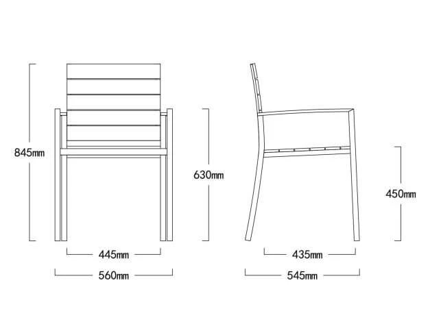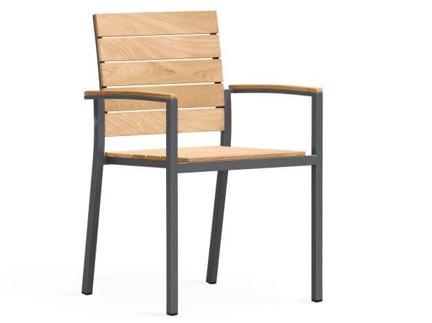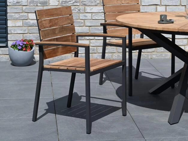 Formschön sind auch die Armlehnen aus hochwertigem Teakholz. Teak ist besonders für seine guten Temperatureigenschaften und stets angenehmer Oberfläche bekannt. Ob für Garten, Terrasse oder den Balkon – dank der anthrazitfarbenen Pulverbeschichtung des Gestells und dem eleganten Materialmix mit Teakholz kann dieser Gartenstuhl mit vielen Gartentischen z.B. aus Aluminium kombiniert werden und ist in jedem Outdoorbereich ein garantierter Blickfang.
