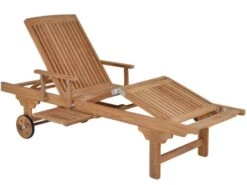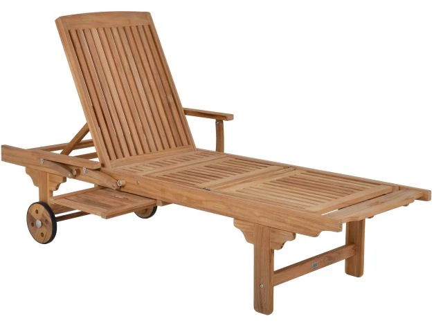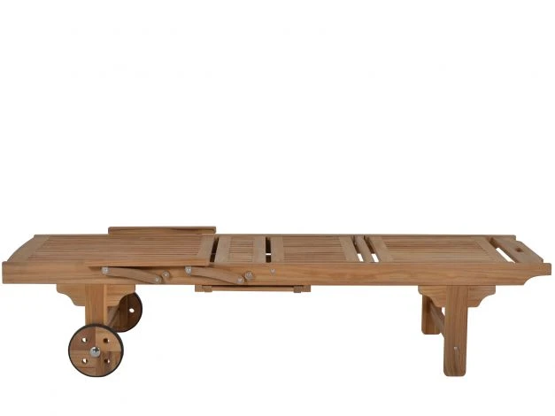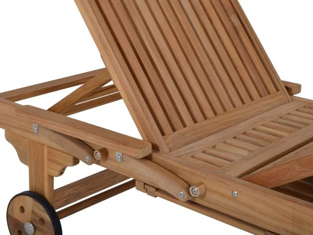 Diese rollbare Teakholzliege bietet besonders komfortablen Ein- und Ausstieg. Die Liegefläche ist extra hoch (43 cm) und somit besonders gut zugänglich. Darüber hinaus lassen sich verschiedene Liegepositionen einstellen: sowohl das Kopfteil als auch das Fußteil lassen sich mehrfach verstellen. Beide Armlehnen können außerdem bei Bedarf heruntergeklappt werden.