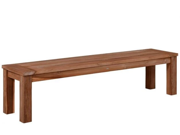Die breite Längslattung wird an den Stirnseiten mit einem gegenläufigen Brett abgeschlossen. Die kräftigen Beine sorgen zudem für soliden Stand und passen optisch zu dem massivem Gesamtbild der Bank.