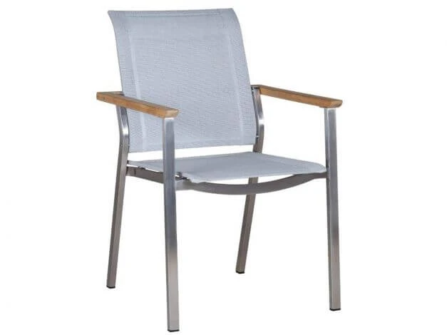 Der Stapelsessel Infinity begeistert mit einem modernen Edelstahlrahmen, der eine textilene Sitz- und Rückenbespannung aus besonders hochwertigem Batyline®-Markengewebe trägt. Ein weiteres markantes Highlight ist die elegant um den Rahmen herumlaufende Armlehne aus edlem Teakholz. Dank seines stilvollen Materialmix lässt sich dieser Zebra Gartenstuhl elegant mit verschiedenen Gartentischen kombinieren. Ob modernes Ambiente oder stilvoll klassische Umgebung – dieser Stapelsessel ist ein garantierter Blickfang.